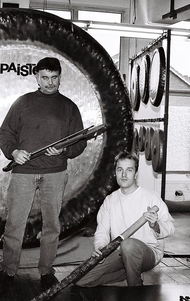 Paiste Werkstatt 1998, Walter Meyer Gongbaumeister und Heiko Schulz-Kosel nach gemeinsamer Klangsession in der Gongmacherei